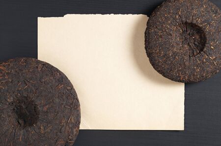 Two pressed Puerh Tea and blank paper on a black wooden background, top view with place for text