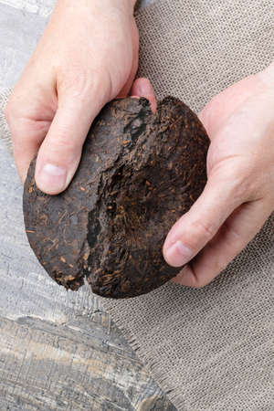 Men's hands break a disc of black pressed Chinese pu-erh tea close-up