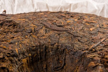 Chinese pressed PU-erh tea on wrapping paper, close-up