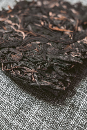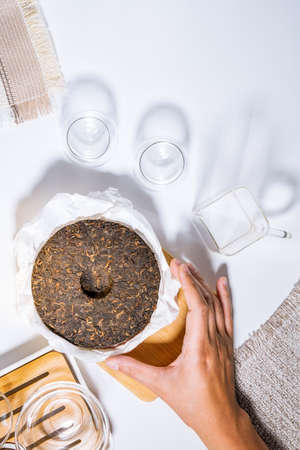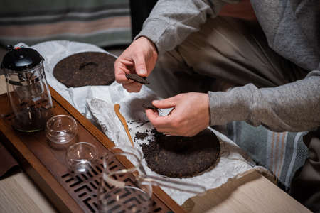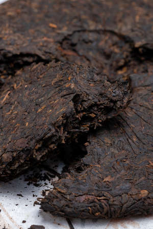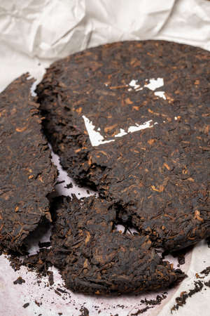 Chinese pu-erh tea. Selective focus on breaking a pressed circle of pu-erh tea. Close up, macro photography.
