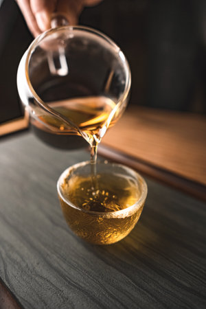 The Elegant and Artful Tea Pouring into a Beautifully Crafted Glass Cup for Enjoyment and Relaxation