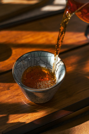 Pouring a delightful cup of traditional tea into a beautifully crafted ceramic cup
