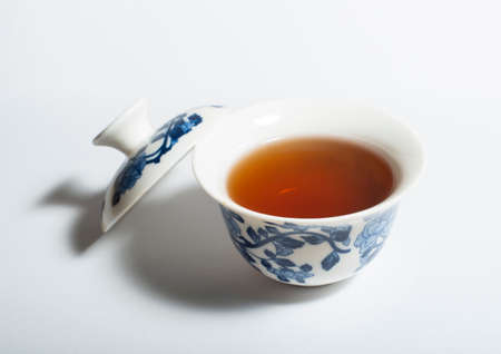 Cup of chinese tea in a lovely traditional tea cup with teapot by the side, isolated.