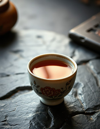 Warm cup of tea on a rustic stone table in a cozy indoor setting during a tranquil afternoon