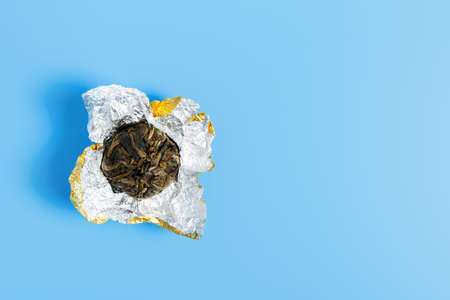 Chinese puer tea pressed in the shape of a ball packed in foil on a blue background. tea shop or tea ceremony concept. Health drink concept. minimalism, copy space.