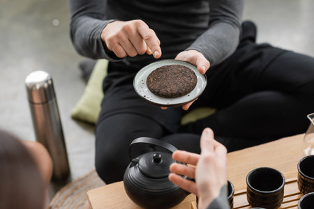 cropped view of man pointing with finger at compressed puer tea in yoga studio