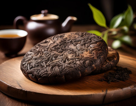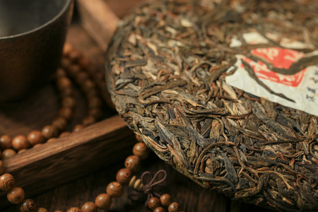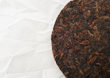Chinese tea ripe Puer in the form of a round pancake on the table. Close up, macro