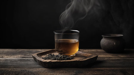 A simple, elegant composition of a steaming tea glass and dried tea leaves on a wooden plate, sitting on a wooden table, with a dark black background for contrast