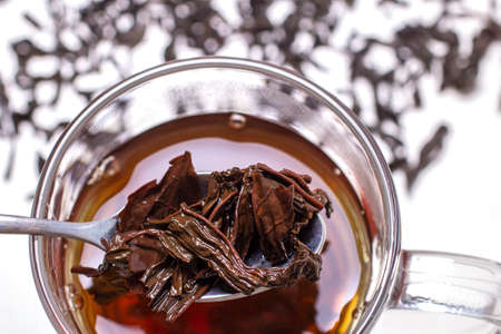 Wet leaves of brewed black natural tea in a spoon over a mug close-up