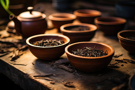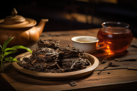 Traditional chinese tea ceremony with pu-erh tea on rustic table. concept of cultural heritage, tea rituals, aromatic flavors.