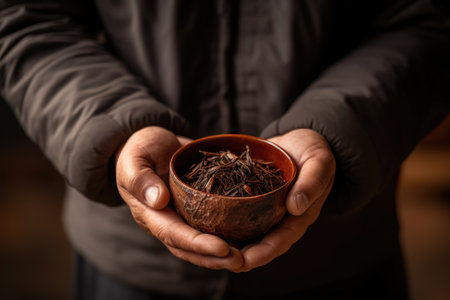 Dry black tea in ceramic bowl on dark background with copy space. AI generated.