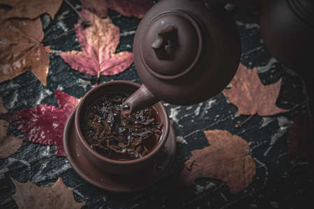 Dried leaves of Chinese tea in a beautiful kiramic soda. Tea ceremony. Red traditional Chinese drink. Dark utensils.