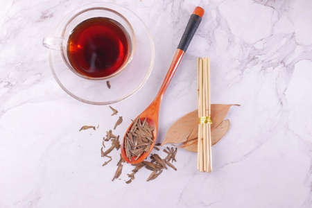 A tea cup with dry tea and wooden background, Hot tea drinking good for health, shot with copy space for individual text, Food and drink concept