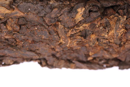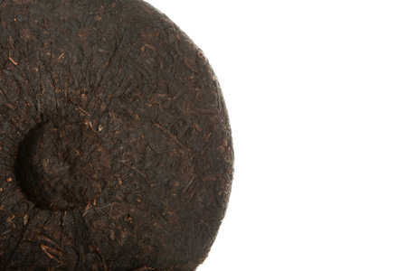 A piece of chinese tea shu puer isolated on white background. Texture fermented traditional compressed tea.