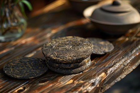 Closeup of aged puer tea cakes beside a clay teapot on a rustic wooden table, with soft lighting
