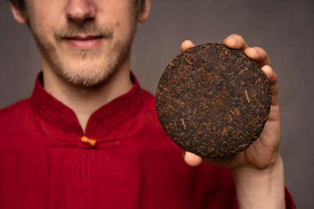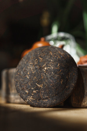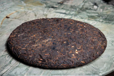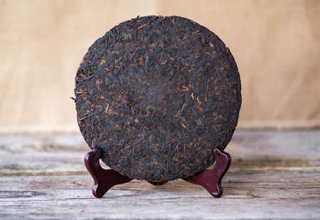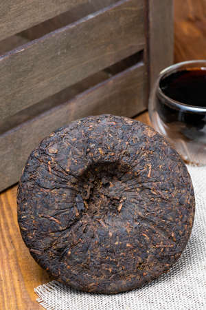 Chinese tea ripe Puer in the form of a round pancake on the table