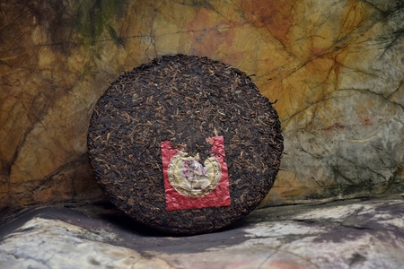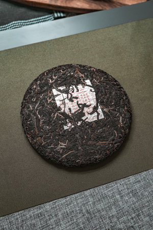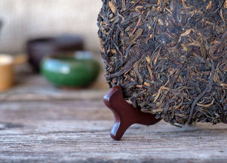The ripe pu-erh tea cake with a label prize-winning tea. Traditional Chinese black tea from Yunnan Province in the natural background.