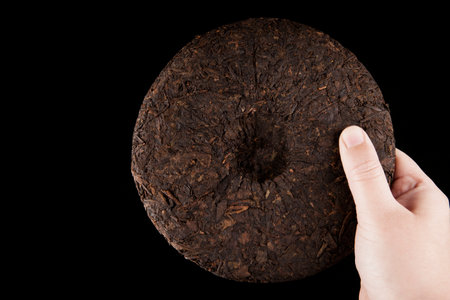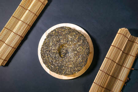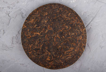 Pressed Pu erh tea top view. Chinese black tea pressed into a pancake. Dry pu-erh tea.