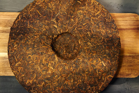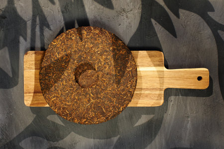 Puer tea rests on a wooden cutting board, showing its rich texture and earthy color.