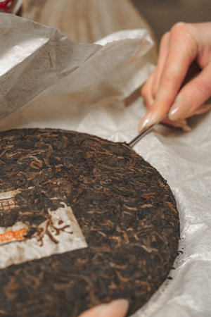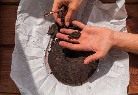 Shu Puerh cake chinese fermented black tea in white paper with knife. Male hands hold chip break pressed old round form ripened dark pu-erh into pieces Healthy invigorating drinks coffee substitute.