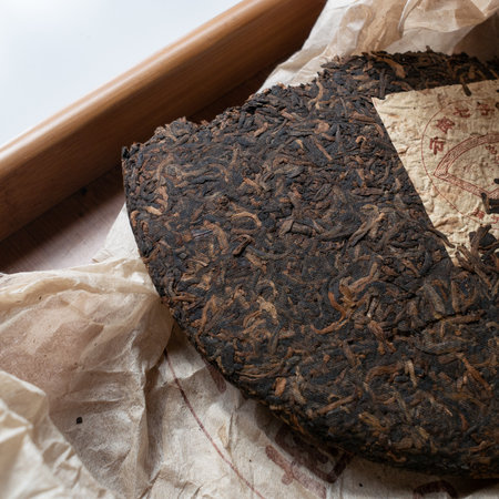 Chinese pressed PU-erh tea on wrapping paper, close-up