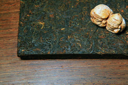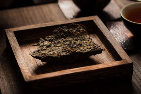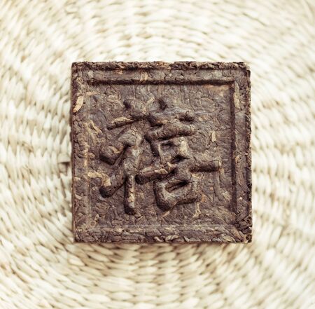 Puer tea from Yunnan region, China. Compressed brick of a fermented tea Pu Erh with a Chinese hieroglyph.