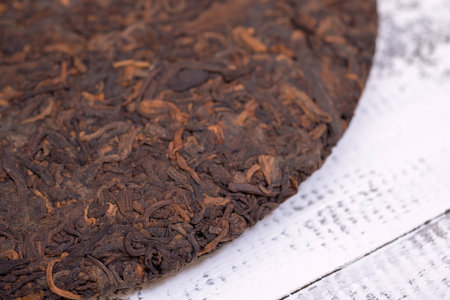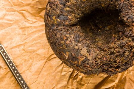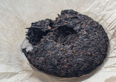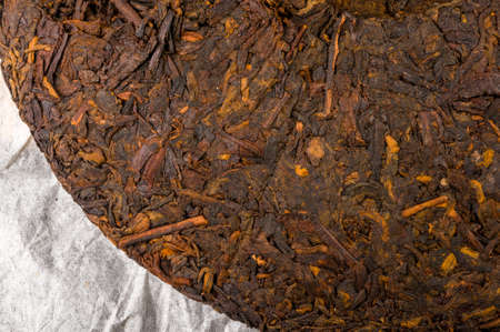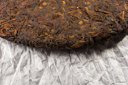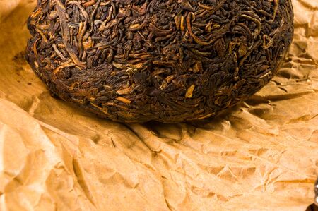 Chinese pressed puer tea on wrapping paper, close-up, macro