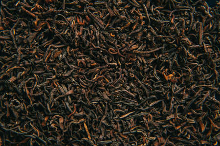 Macro background of dried leaves of aromatic black tea with cinnamon