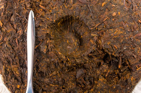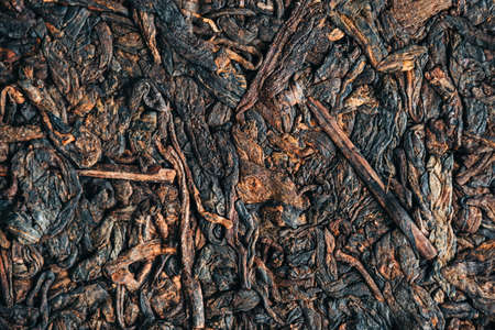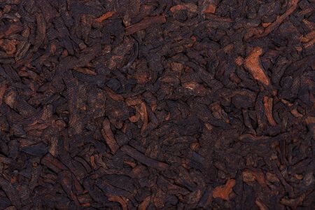 Chinese tea Shou Puer. Pressed fermented Pu-erh tea. Macro close up. Aromatic black puer tea. Healthy drink. Texture