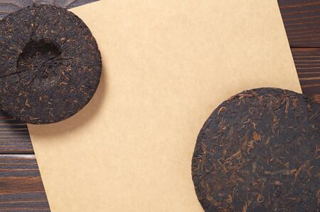 Two pressed pu-erh tea and blank paper on a brown wooden table, top view with space for text