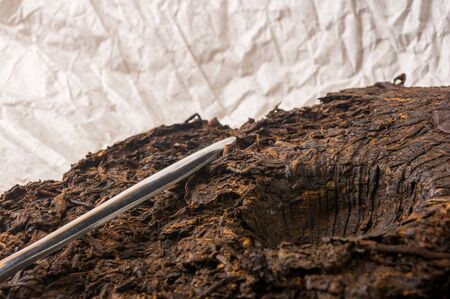 A man prepares raw ripe tea for a tea ceremony. Picks out a piece of tea with a tea needle. Hands close-up.