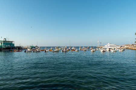 Avalon harbor in Santa Catalina Island with sailboats, fishing boats and yachts moored in calm bay, famous tourist attraction in Southern California, USA. June 20th, 2020