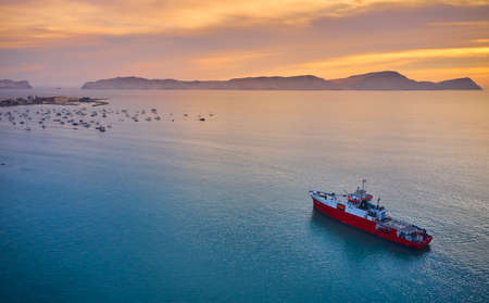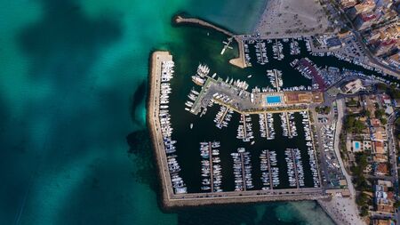 Aerial shot, drone point of view turquoise waters bay of Mediterranean Sea, moored vessels in harbour in coastal town of Calpe, Costa Blanca, province of Alicante, Spain. Travel and holidays concept