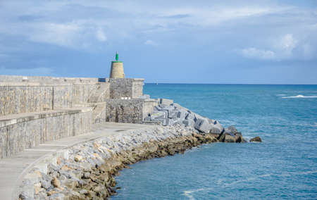 Agde, France - January 01, 2019: street atmosphere of the quays of the port of Agde where people are walking on a winter day