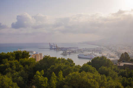 Aerial view of a cargo dock, commercial port in Malaga, Spain. Lighthouse, cranes and marina.