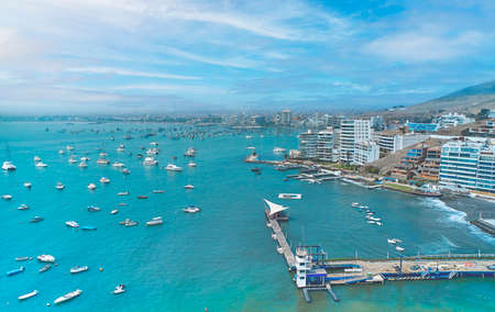 Aerial view of the bay, marina and buildings of Ancon - Lima, Peru; Summer area, The beach and some exterior buildings in Ancon.