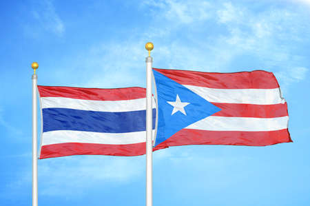 Thailand and Puerto Rico two flags on flagpoles and blue cloudy sky background