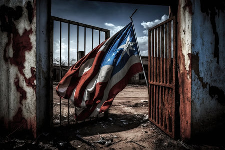 torn and tattered flag hanging on the broken gate of abandoned factory, created with generative ai