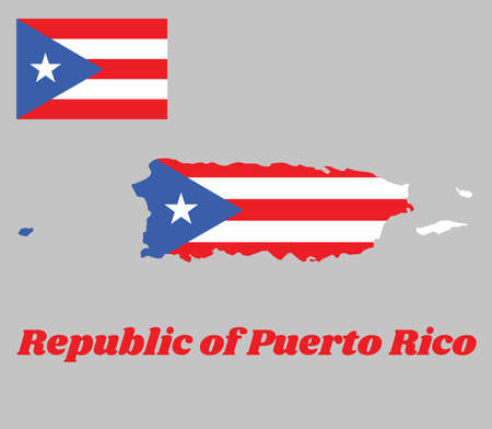 Map outline of Puerto Rico, horizontal white and red bands with isosceles triangle based on the hoist side and white star, text name Republic of Puerto Rico.