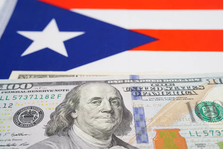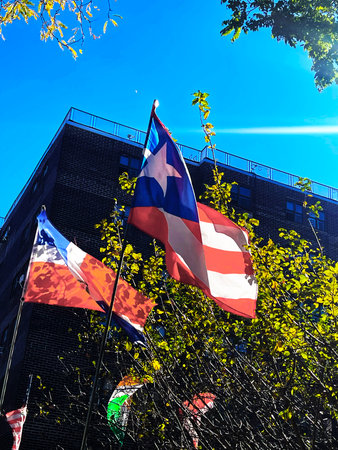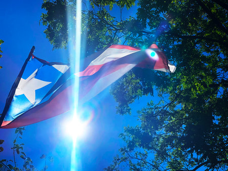 The Puerto Rican national flag with its iconic colors. The festive bokeh background of colorful lights is perfect for celebrations, Caribbean pride, and major national events.
