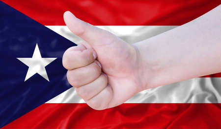 Hand makes a thumbs up sign on the background of the flag of Puerto Rico. like, good, positive