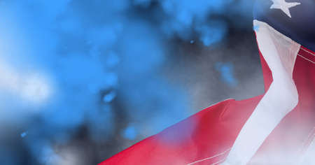 Composition of american flag billowing against colourful blue flare smoke. patriotism, independence and celebration concept digitally generated image.