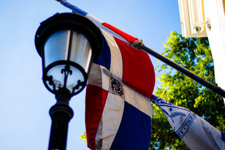 Flag of the Dominican Republic and the flag of Puerto Rico against the background of the blue sky.