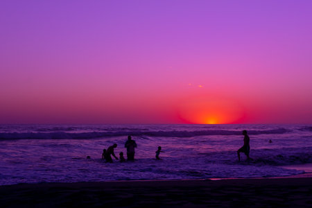 Silhouette of people walking on the beach at sunset time. people bathing in one of the most famous beaches in El Salvador. sunset on a beach