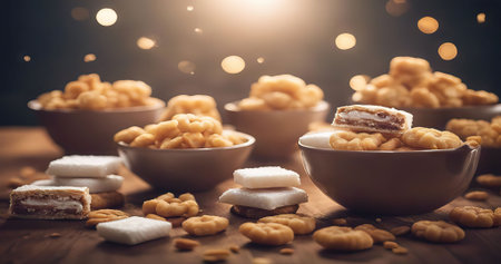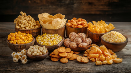 A vibrant assortment of snacks displayed in wooden bowls on a rustic table, showcasing a variety of textures and flavors