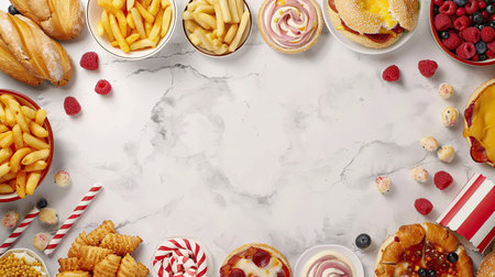 Colorful assortment of junk food items forming an enticing double border on a refined white marble backdrop