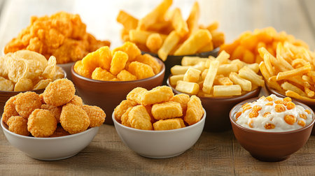 Top view of onion rings, cheese balls, chicken nuggets, wings in batter, fries and cheese sticks. Six-course set in paper buckets. Fast food cafes and restaurants. Food is laid out in shape of flower