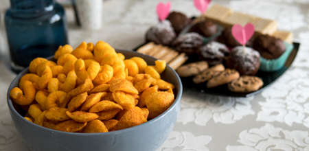 junk fast food and unhealthy eating. assortment of spicy salty chips peanuts and croutons on a plate on dark background