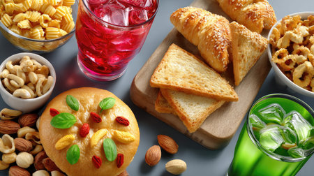 A vibrant display of delicious snacks and refreshing beverages ideal for gatherings. Enjoy a colorful assortment perfect for sharing moments with loved ones.