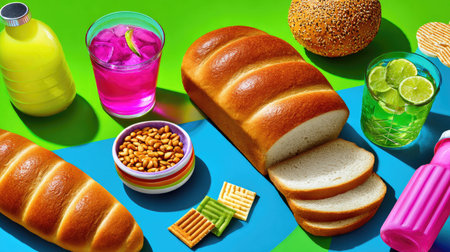 This vibrant stock photo showcases an enticing arrangement of assorted snacks and refreshing beverages, perfect for summer gatherings or picnics.